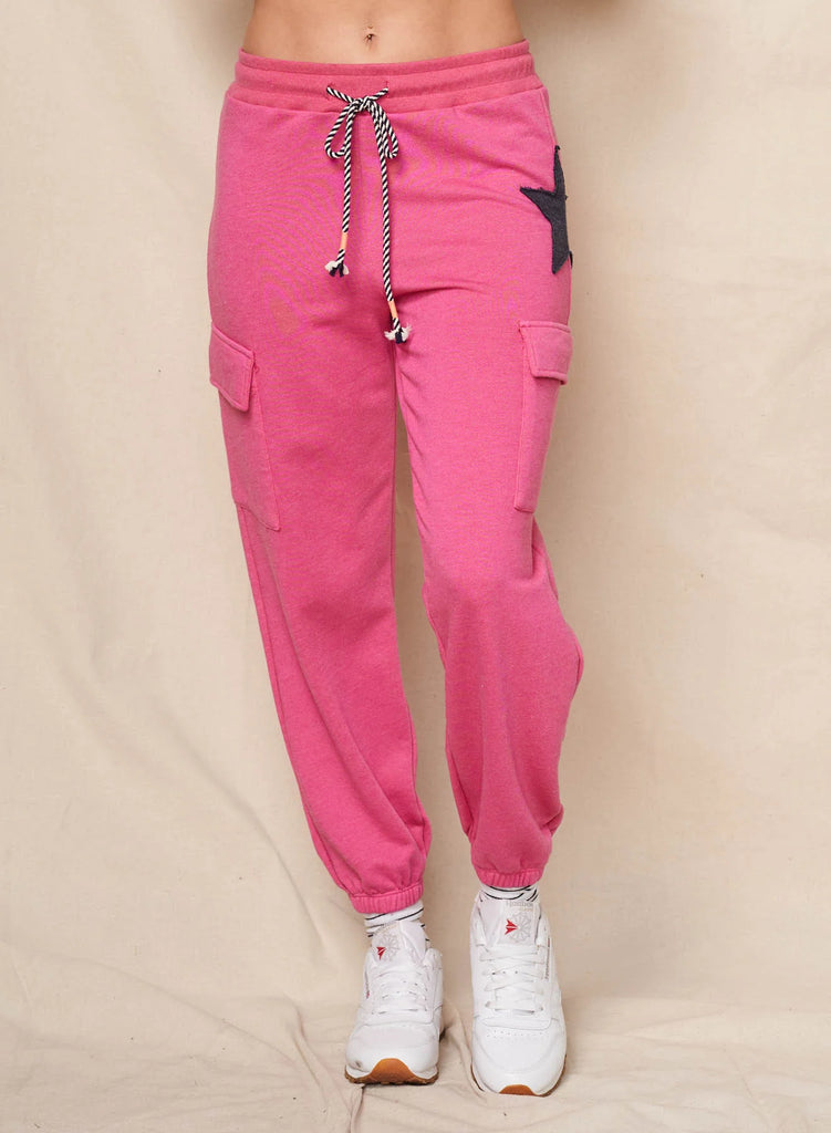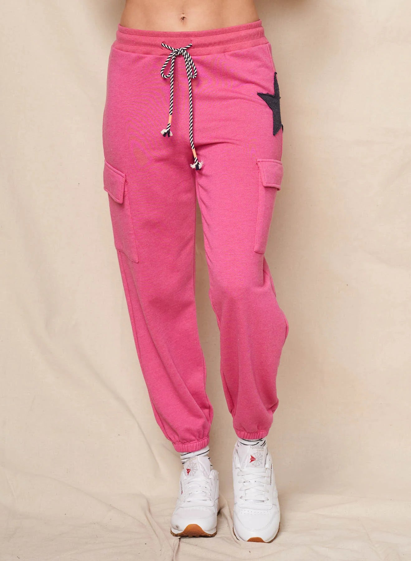 These jazzy rose joggers feature a relaxed cargo fit with side pockets, a contrast drawstring waist, and a bold star patch detail on the leg. Finished with elastic cuffs, they bring a playful twist to an everyday casual look.