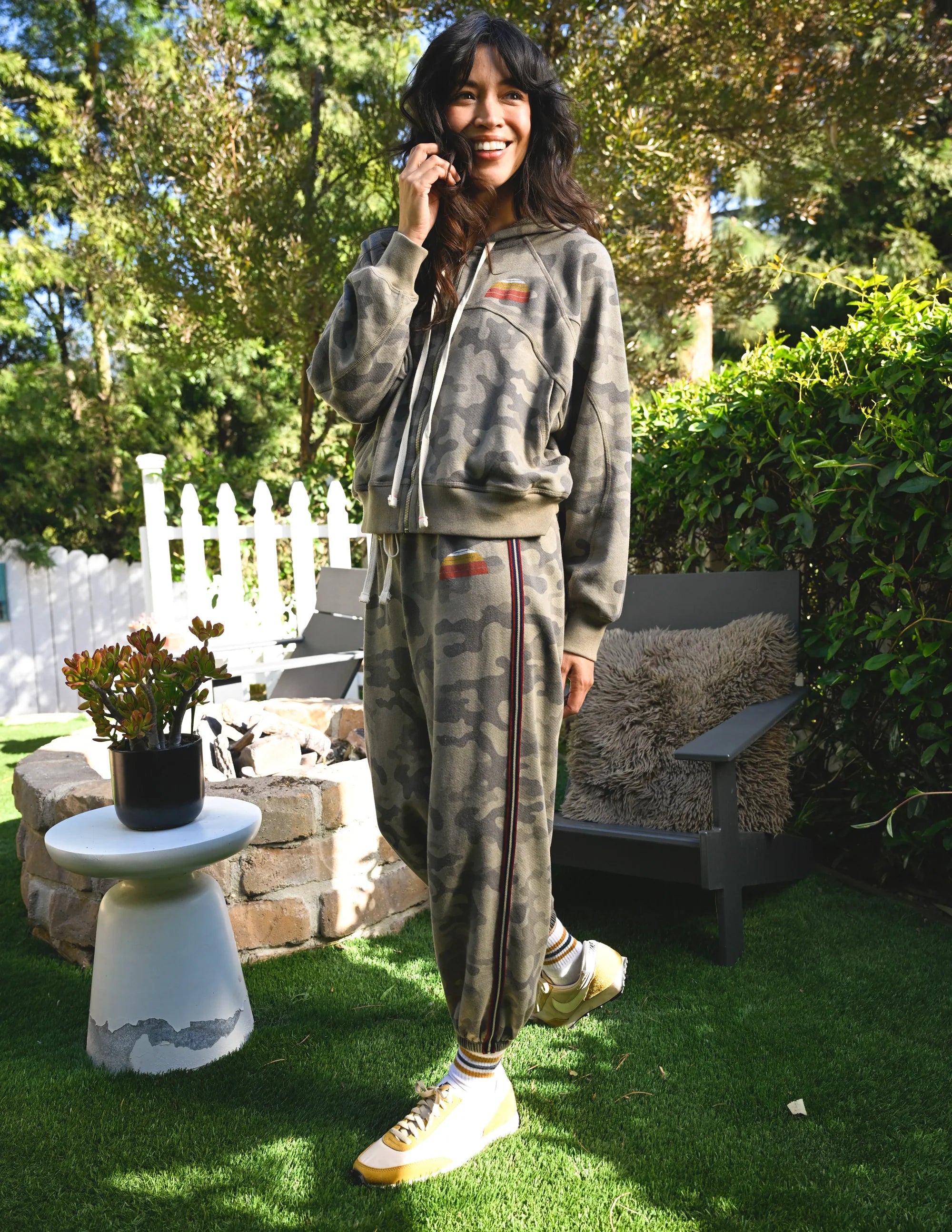 These camo joggers feature a relaxed fit with an elastic drawstring waistband and cuffed ankles. A small rainbow stripe graphic at the hip adds a colorful accent to the classic camouflage print.