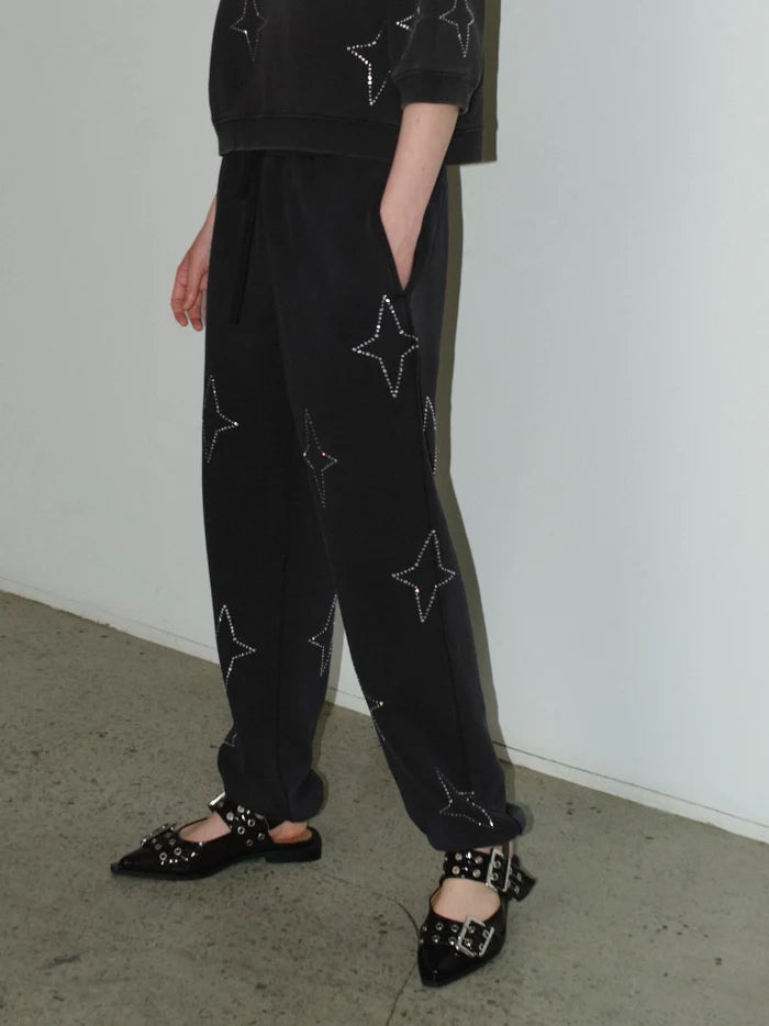 Kassidy sweatpants bring vintage cool with a modern attitude. Crafted from 100% cotton for all-day comfort, these black bottoms feature eye-catching rhinestone stars that add just the right amount of sparkle and sass. Perfect for lounging with personality or making a statement wherever you go.