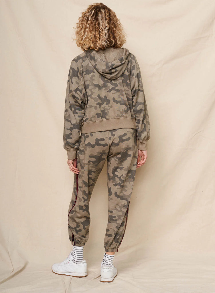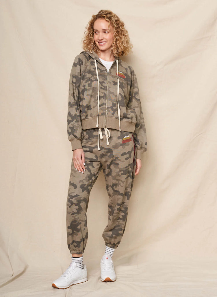This camo zip-up hoodie features a relaxed fit with a drawstring hood and ribbed cuffs and hem. A small rainbow graphic on the chest adds a pop of color to the rugged print.