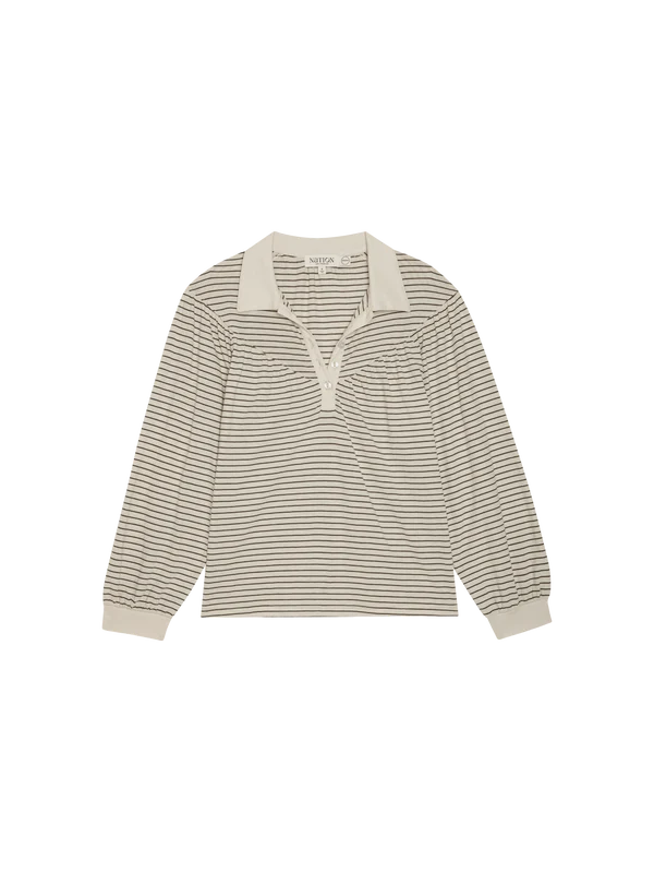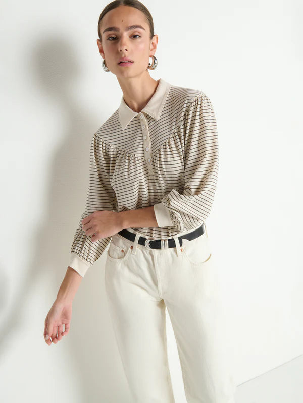 The Cecila Tee offers a feminine take on the polo. A collared neckline, shell buttons, and shirred cuffs add structure, while the easy 100% organic cotton drapes just right.